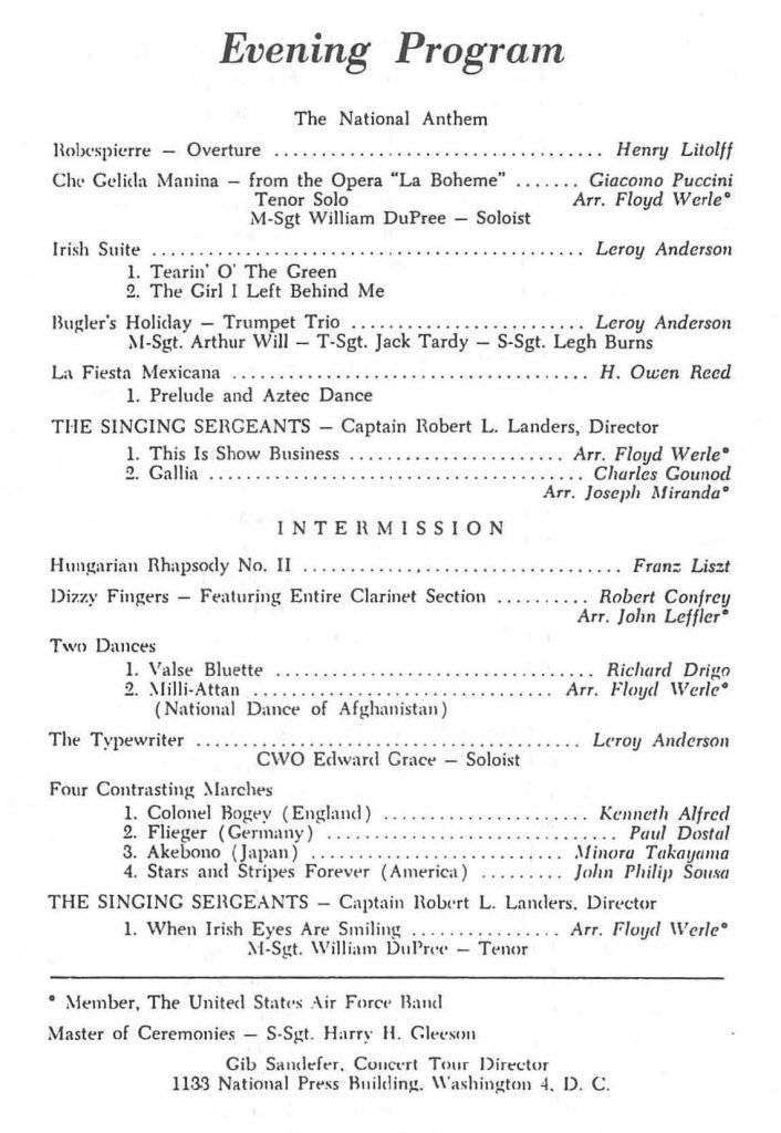 It had been predetermined that the five or six young men coming into the band would also be members of the Singing Sergeants. None of us wanted to do this because it not only conflicted with the orchestra but meant a great deal of extra duty, as the choral group was constantly performing around Washington. Therefore when we “auditioned,” which consisted of singing together, “Oh Come All Ye Faithful,” we made every effort to sing out-of-tune, with wrong pitches, and horrible intonation. No sooner had we struggled our way through than the Captain leaped up and cried, “You’ve made it!” Fortunately for my plans to attend a university while I was in the Air Force, the first horn player went to the Commander and had me removed from the Singing Sergeants and returned to the orchestra.