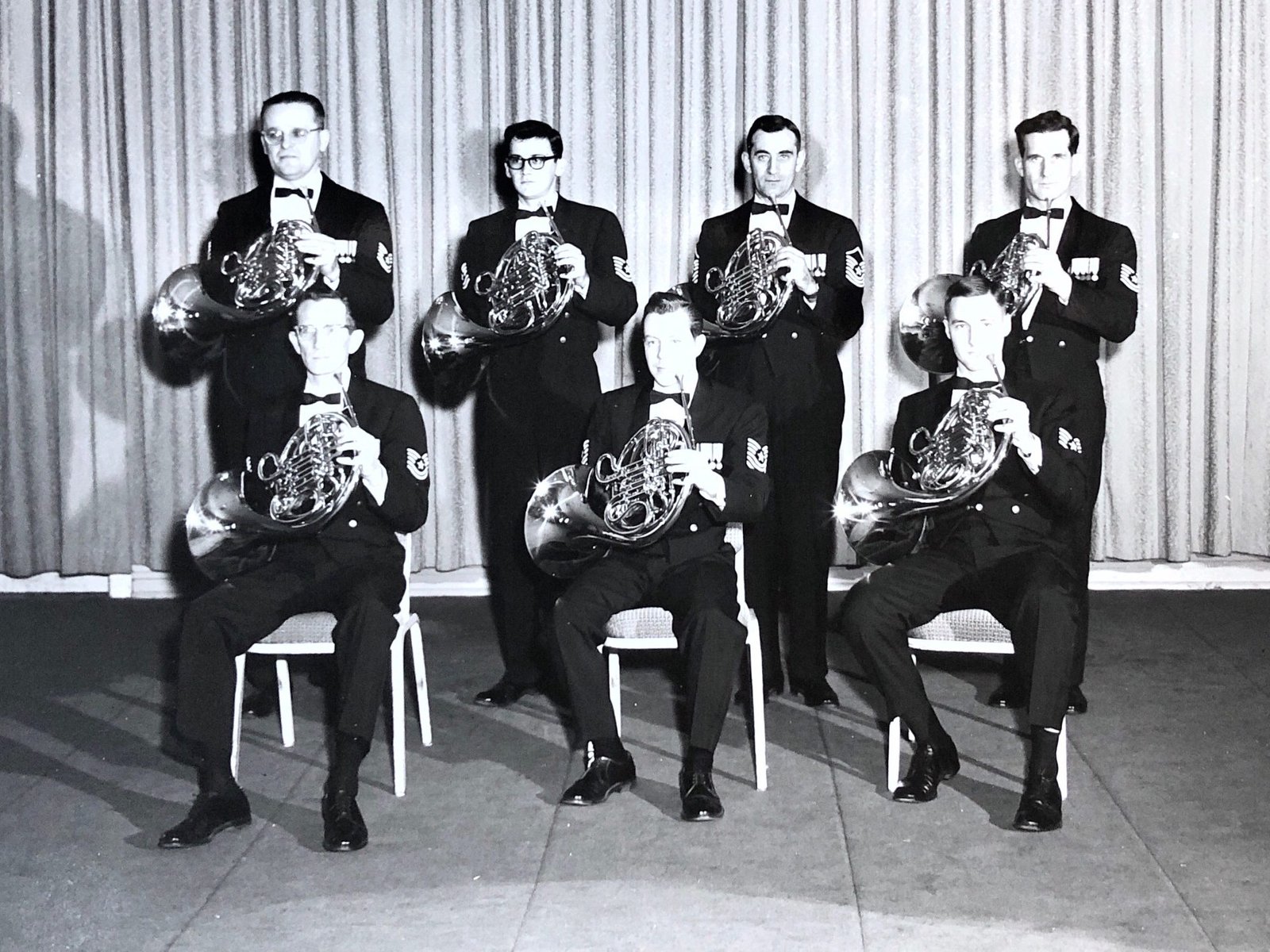 The Air Force Band at this time consisted mostly of older men who had been trapped by World War II and were serving out their twenty years before retirement. Many of them had been members of great orchestras before the war and were outstanding players and musicians. I learned a great deal from them about music, performance, and the professionalism of the art. I recall, for example, an interesting psychological lesson I learned during the very first rehearsal I played when the full band returned from tour. I was assistant first horn and as I was playing I missed an attack or two—something which had always been rather overlooked in my experience as a horn player (“The horn is such a difficult instrument!”). The first horn player, a man who had been a member of the Boston Symphony, leaned over to me and said, simply, “We don’t miss notes.” And from that day on I played with a level of accuracy which earlier I would have never believed I could have achieved!