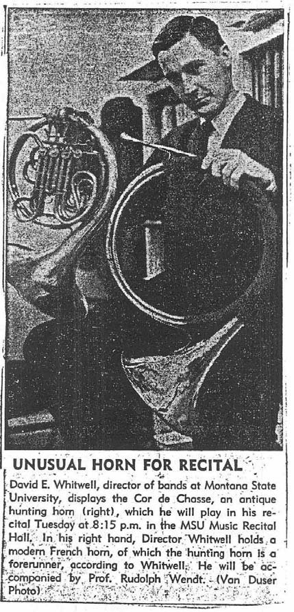 - David Whitwell, “The State of Bands in Montana,” Cadenza, May 1964.