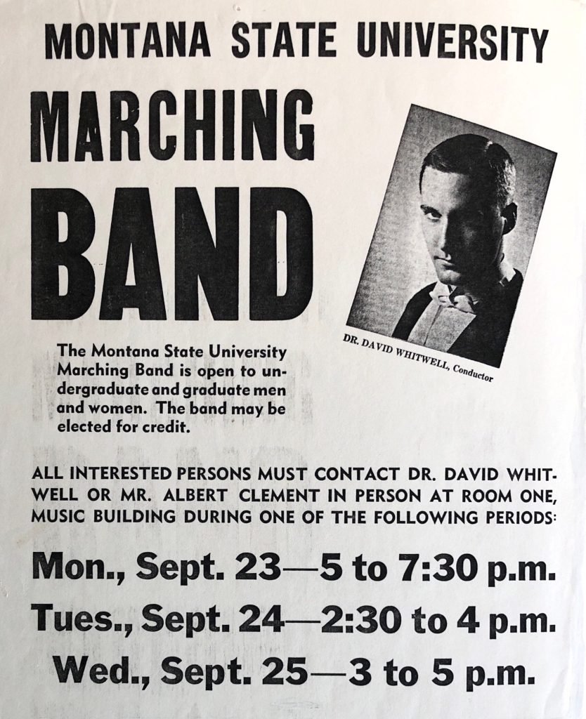 I was immediately thrown into a state of panic and at first saw no possibility that I could accept such a position. While I had had four years experience in the Michigan Marching Band, I had never had a course in marching band techniques. Even if I were experienced in running a marching band, the fact that I would only be arriving in Missoula the week before classes began would obviously leave no time for preparing a marching season. I was about to call and withdraw from the position when someone mentioned that there was an oboist, Jerry Domer, in the Army band who was a graduate of Montana whom I might contact. I called Jerry and explained my situation. He urged me to go ahead and take the position, saying that the marching band was so bad that no matter what I did it would be taken as a great improvement. Since it was clearly too late to find another position, I decided to take his advice and gamble. As it turned out, Jerry was correct. Upon arrival I viewed some films of the previous marching season and it was immediately apparent that the previous conductor simply did not take the marching band seriously.