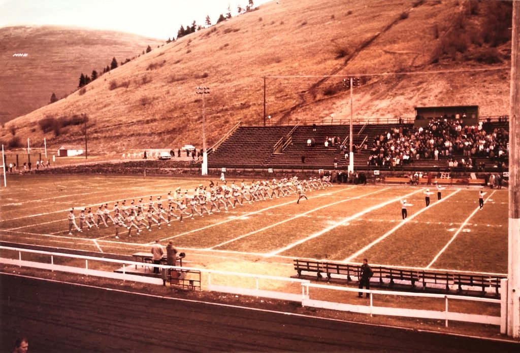 Since I arrived just before classes started, I had no time to prepare the marching season, so I just wrote the shows, and music, one show at a time and somehow got through the season. The only marching show style I knew, from Michigan, at that time, was the old “picture show” format: picking a story, finding music which had some remote topical relationship, and then designing stick-figure formations and script to carry out the story. While such “pictures” could be seen from the high Michigan stadium, it was soon obvious that the concept had little effectiveness in a small stadium such as the one in Missoula. I was therefore very pleased when another college band director, Otto Werner, who traveled to Missoula with his school’s team, sent me his “personal compliments for a very fine performance in extremely cold weather,” and asked if he could borrow some of my ideas for use the following year.